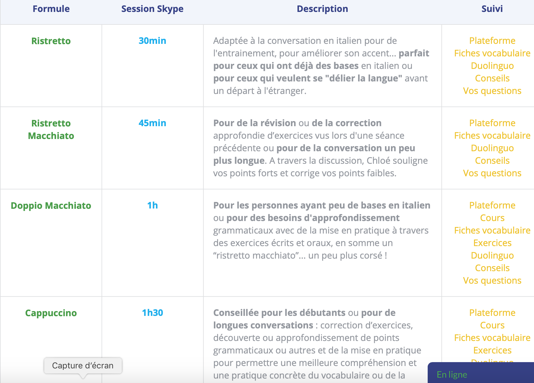 Le rappel de la leçon et les exercices sont disponibles 24 heures/24 avec le suivi de la professeure et sa sĂ©lection trĂšs pointue et juste d’outils complĂ©mentaires (et elle est toujours en recherche active de nouvelles). Ces ressources ouvrent un champ d’action infini pour complĂ©ter les sessions Skype et en sont le prolongement logique. Aujourd’hui un cours de langue ne peut plus ne pas ĂȘtre associĂ© avec de tels outils et ne vendre que des heures. Une des rares Ă l’avoir compris…