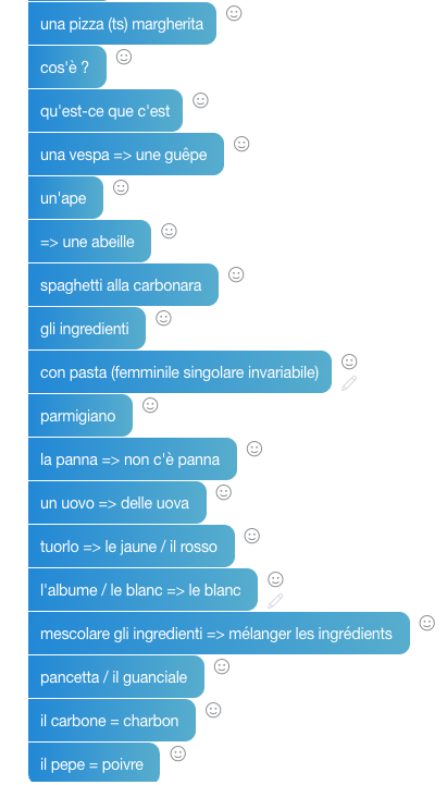 Lors de la session ChloĂ© tentera de vous parler un maximum en italien pour vous mettre dans le bain et surtout de vous faire parler. Dans le cas du visuel ci-dessus, des mots, souvent familiers, permettent de faire un premier lien entre la langue que vous apprenez et votre « fonds » personnel plutĂŽt riche en raison des origines latines communes. La professeure saura vous donner la prononciation prĂ©cise Ă respecter (piĂšge de l’italien dit « proche » du français) et, parmesan sur les pĂątes, vous ajoutera de nombreuses rĂ©fĂ©rences culturelles et touristiques (pourquoi ces pĂątes s’appellent carbonaraâŻ?)