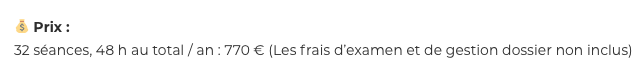 Des prix variables selon les services et directement affichés sur la page dédiée ou sur demande. Des tarifs correspondants au marché de la formation professionnelle (donc pas à celui du marché libre). Exemple pour le cours en petit groupe :