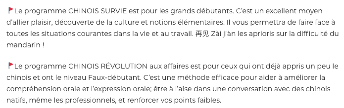 Une approche pédagogique intelligente et excellente (pour une langue réputée difficile) et qui se démarque de la concurrence. Notons que les vidéos d’apprentissage en ligne sont bien sûr des accroches pour les cours webcam ou présentiels, mais celles sur le travail de prononciation sont particulièrement réussies et méritent le voyage, car l’usage du pinyin est un exercice délicat qui conditionne la suite de votre apprentissage. Amy propose un remède de cheval à ce problème !