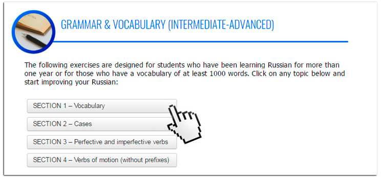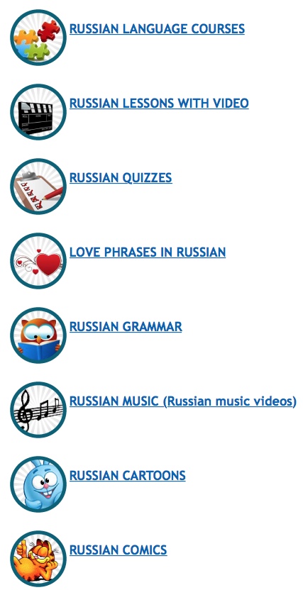 Russian for free, c’est d’abord un menu copieux, un brin ringard, qui propose des plats de rĂ©sistance pour tous les niveaux (grand atout du site). Les icĂŽnes sympas et au combien descriptives sont Ă mettre encore plus en avantâŻ!
