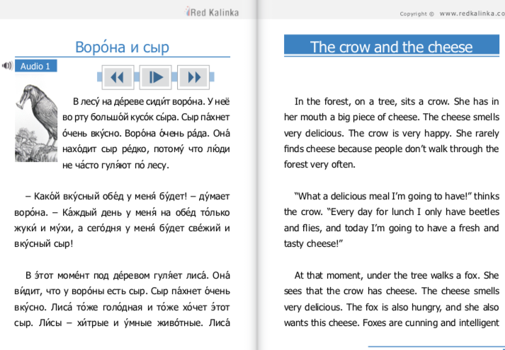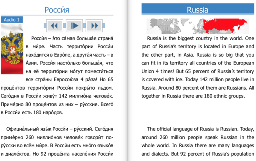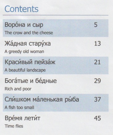 MĂȘme prĂ©sentation pour une sĂ©rie d’histoires qui apportent un intĂ©rĂȘt supplĂ©mentaire par le suspens de la lecture. Pas de vocabulaire mis en avant mais une traduction qui permet de travailler la comprĂ©hension Ă l’Ă©crit avant de passer Ă celle de l’Ă©coute. Une autre façon de travailler pour un texte beaucoup plus long oĂč l’on retrouve le plaisir de la lecture. La comparaison texte-traduction est ici un excellent moyen de comprendre et d’acquĂ©rir les tournures de la langue russe. On finit par lire naturellement du russeâŻ!