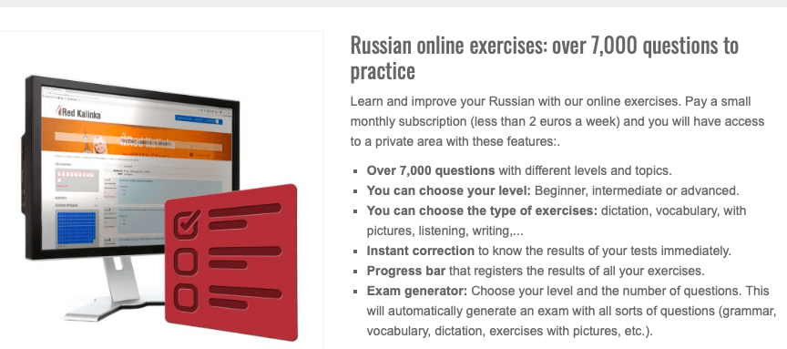 L’univers Kalinka pour apprendre le russe, c’est un site de ressources gratuites et un autre pour les cours et produits payants, Red Kalinka (chapitre 2).