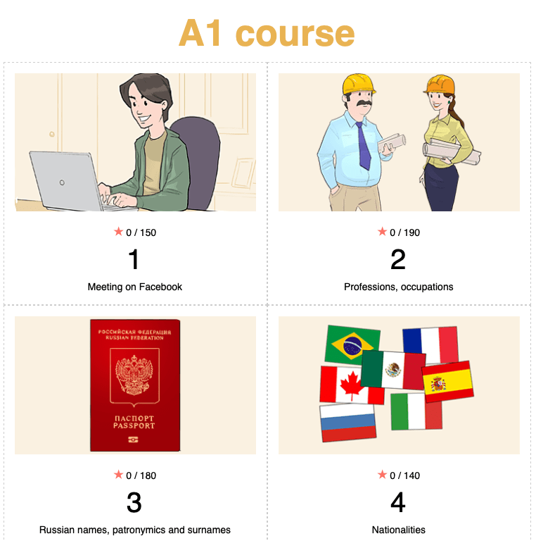 Une fois choisi son niveau, on accĂšde Ă un damier de cours. On peut ainsi librement construire son apprentissage et ne pas ĂȘtre prisonnier(e) d’une mĂ©thode linĂ©aire. La navigation permet de rĂ©essayer les exercices, passer Ă une autre leçon, zapper une Ă©tape (mais on a zĂ©ro point pour cette page), bref une promenade en toute libertĂ©âŻ! Les leçons sont regroupĂ©es par thĂšmes trĂšs actuels comme visibles dans les exemples ci-dessous.