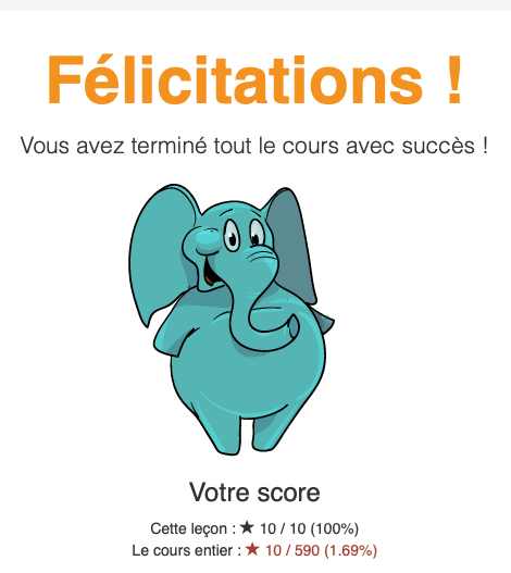Pour finir, votre score de bonnes rĂ©ponses que l’on retrouve aussi sous les images des leçons pour mieux gĂ©rer votre parcours (ce que j’ai fait, ce que je dois refaire…)