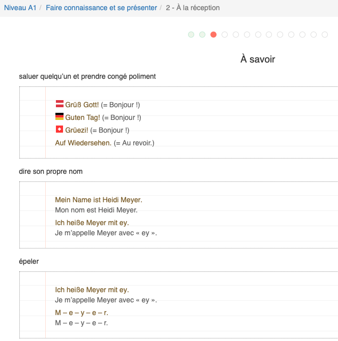 Le cours est une succession de pages matĂ©rialisĂ©es par de discrets ronds sous le titre et que l’on doit travailler dans l’ordre. D’apparence simple, elles demandent une attention soutenue. Un point fort, la possibilitĂ© de refaire les exercices Ă chaque page avant de poursuivre.