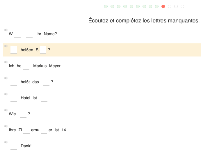 Les exercices, Ă l’apparence facile et aux dessins sympathiques, travaillent la langue choisie avec diffĂ©rentes approches (et mine de rien en profondeur) en utilisant une rĂ©pĂ©tition espacĂ©e pour une meilleure mĂ©morisation. Les rĂ©ponses ont disponibles en fin d’exercice Ă chaque page sur demande et avant de poursuivre. Quelques prĂ©cautions : ne pas faire « entrĂ©e » avec la touche ad hoc sinon l’exercice se finit avec plein de blancs et un mauvais score, ĂȘtre trĂšs prĂ©cis en mettant bien par exemple les majuscules au bon endroit, le correcteur Ă©tant impitoyable. Les erreurs sont en rouge, mais rien de spĂ©cial pour les bonnes rĂ©ponses en vert-bleu pastel.