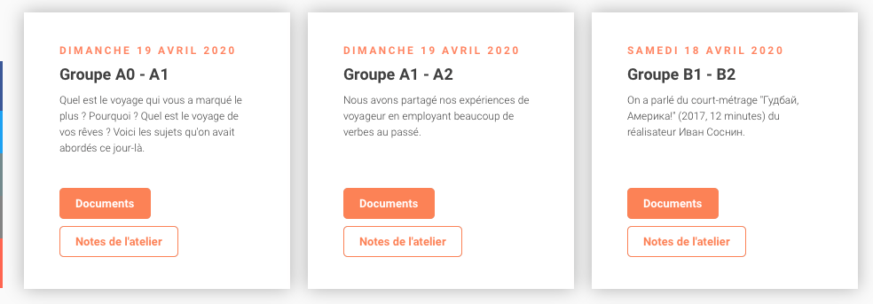 TrĂšs important, les ateliers sont organisĂ©s par niveau (cadre europĂ©en) et durent une heure chacun. De grand dĂ©butant (A0), ils vont jusqu’au C1. Bien choisir son groupe, ni trop difficile (blocage Ă l’expression assurĂ©e et gentillesse pour les autres) ni trop facile (pour un vrai progrĂšs).