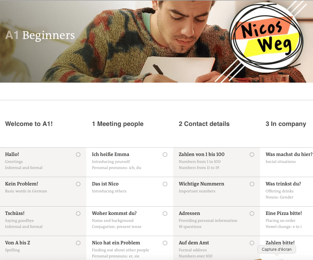 Si vous avez quelques connaissances d’allemand vous prendrez dĂ©jĂ plaisir Ă regarder les aventures de Nico en Allemagne. Le film vous rendra curieux et accro tout en proposant une immersion culturelle oĂč l’on dĂ©couvre aussi le poids des prĂ©occupations sociales de l’Allemagne d’aujourd’hui. Le rythme, le vocabulaire et les interactions de Nico des vidĂ©os sont particuliĂšrement bien choisis et adaptĂ©s aux apprenants de la langue. Un travail de prĂ©cision et de grande qualitĂ© toute allemandeâŻ! La diversitĂ© des exercices, la libertĂ© et fluiditĂ© de la navigation, les outils trĂšs complets, la forme et les thĂšmes vous feront oublier les idĂ©es fausses et nĂ©gatives sur la langue allemande. Une vraie rĂ©ussite et un chouette truc pour la dĂ©marrer ou la revoir.