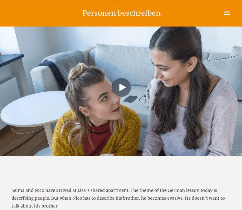 Les cours proposĂ©s par DW (voir en fin d’article la description) utilisent des vidĂ©os extraites d’un film racontant l’arrivĂ©e d’un jeune Ă©tudiant espagnol en Allemagne et ses aventures dans le pays. Elles sont sobres, ancrĂ©es dans la vie rĂ©elle et s’inspirent des « Novellas » brĂ©siliennes (suspens, passion…) dans une ambiance jeune et internationale d’une belle qualitĂ©, elles sont reprises dans les cours morceau par morceau et sont le point de dĂ©part de l’apprentissage de l’allemand « vivant » !