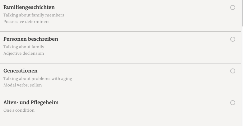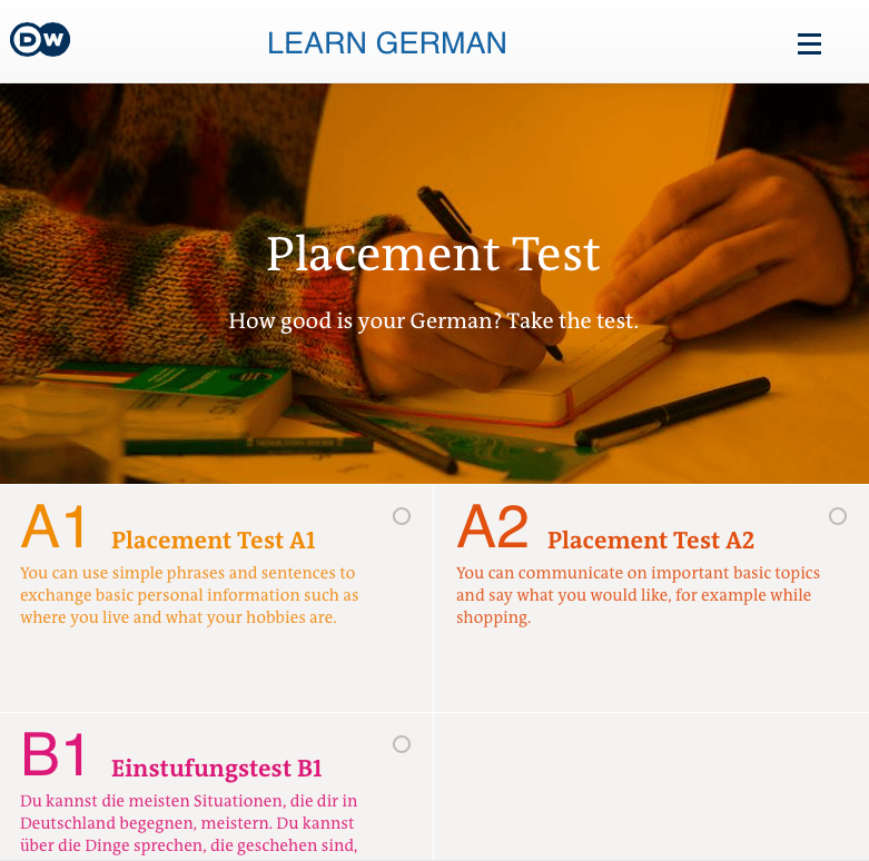 Commencer par un test de niveau (cadre europĂ©en) est un premier pasâŻ! Il est conçu pour des dĂ©butants et initiĂ©s. On peut choisir dans le menu principal l’option anglais-allemand ou tout allemand (recommandĂ© pour les plus avancĂ©s pour ĂȘtre encore plus dans le bain).
