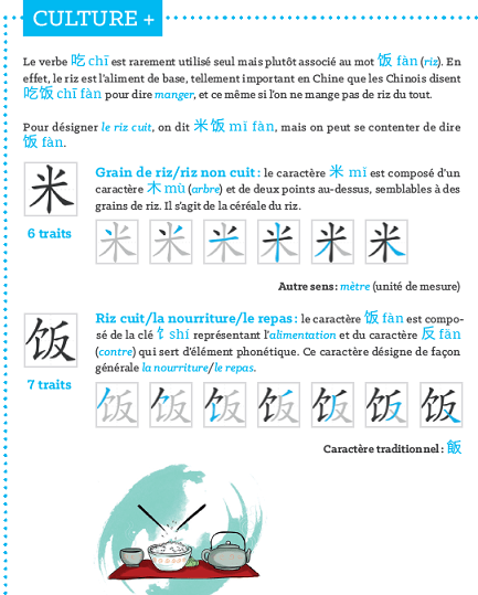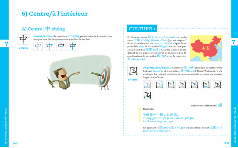 Observons la prĂ©cision des explications dans lesquelles sont naturellement inclus les caractĂšres Ă la lecture facile par leur couleur et taille plus grande et l’ajout de la transcription en Pinyin dans le texte. Les caractĂšres Ă apprendre (grand carrĂ©) et leurs scenarii d’Ă©criture sont imbriquĂ©s. Un Ă©lĂ©ment pĂ©dagogique majeur pour intĂ©grer vraiment dĂšs le dĂ©part l’Ă©criture et ne pas dĂ©velopper un apprentissage bancal.