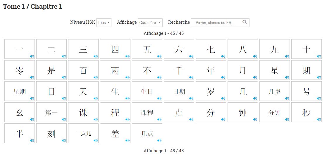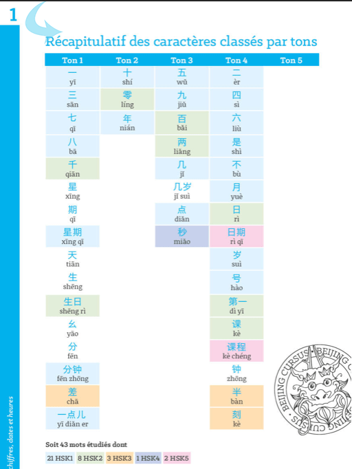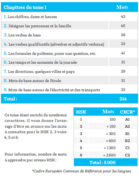 314 mots Ă apprendre pour le kit bleu du HSK 1 (attention un mot n’est pas toujours un caractĂšre, un certain flou dans cette dĂ©finition existe pour les mĂ©thodes de chinois) rĂ©partis dans des chapitres thĂ©matiques :