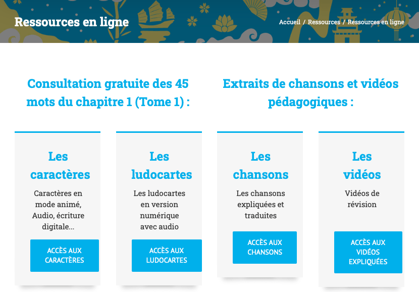 | Les ressources pĂ©dagogiques en ligne viennent complĂ©ter utilement et agrĂ©ablement lâoffre avec: Les caractĂšres animĂ©s et les audios ainsi que la possibilitĂ© dâĂ©crire les caractĂšres en ligneLes e-ludocartes Les vidĂ©os de rĂ©visionLes chansons expliquĂ©es |