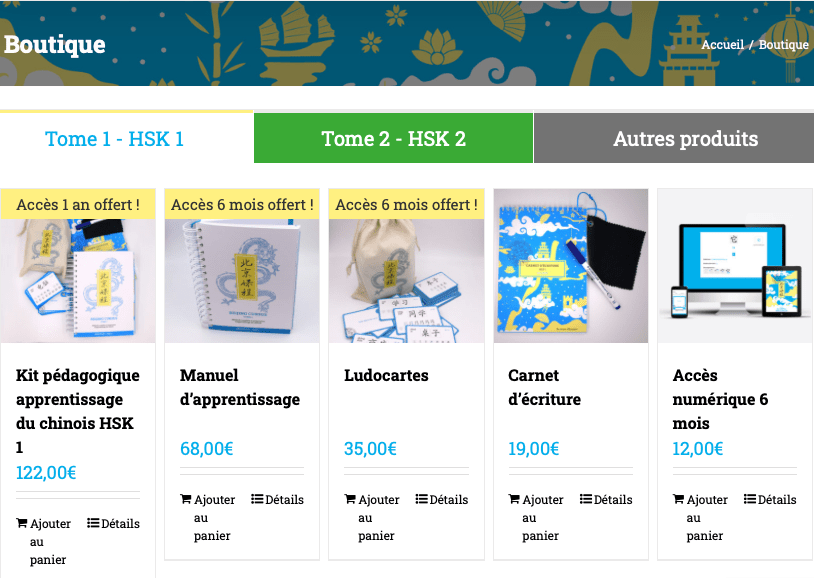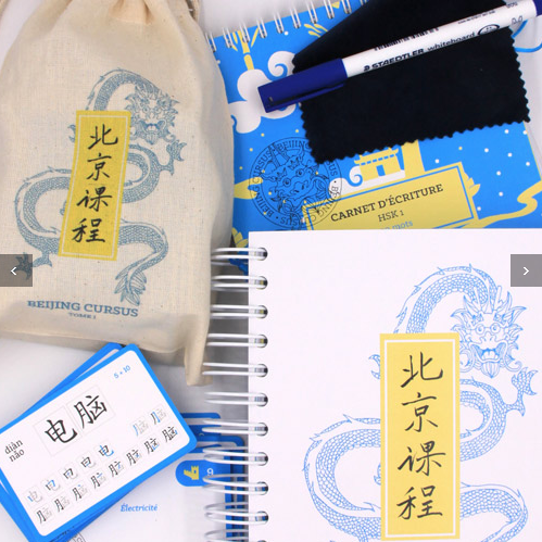 Un nom Ă©voquant la Chine et l’apprentissage pour cette mĂ©thode de mandarin aux multiples atouts. DiffĂ©rents Ă©lĂ©ments la composent et sont proposĂ©s en kits (HSK 1, 2 et 3) ou produits sĂ©parĂ©s. Les niveaux correspondent Ă des examens officiels HSK dont l’un des critĂšres est le nombre de caractĂšres appris (150, les plus courants, pour le HSK 1). Le premier kit (bleu) inclus, par exemple, ces 150 caractĂšres, mais en propose plus de 300.