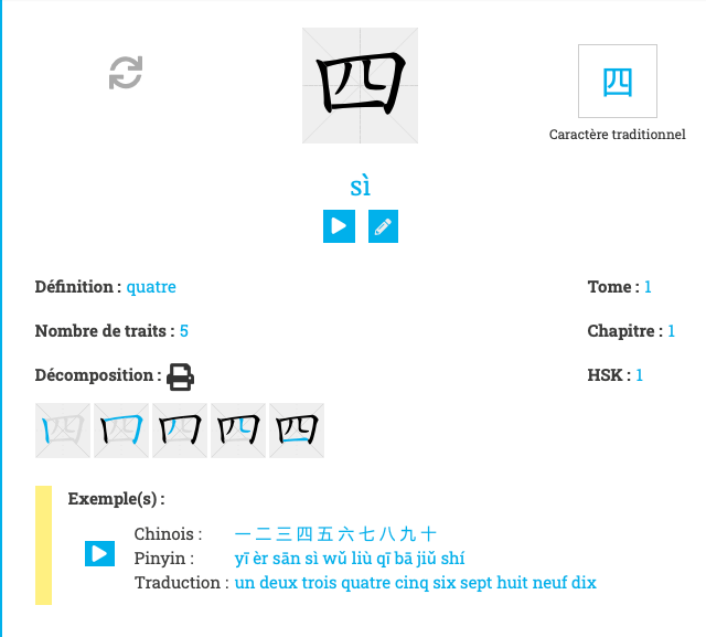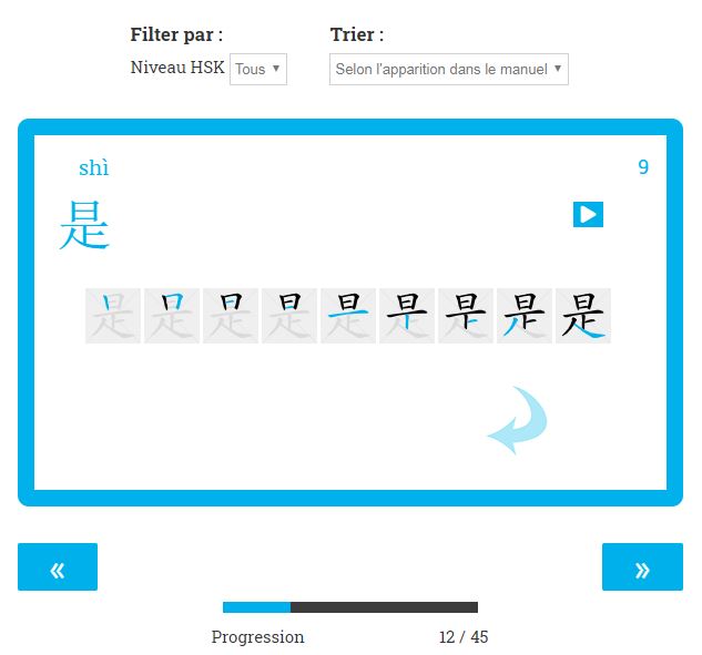 Cette fonction permet de vĂ©rifier, d’apprendre ou de rĂ©viser les caractĂšres un par un. TrĂšs bel outil dont il faut abuserâŻ! TrĂšs complet et au visuel parfait, une rĂ©ussite…