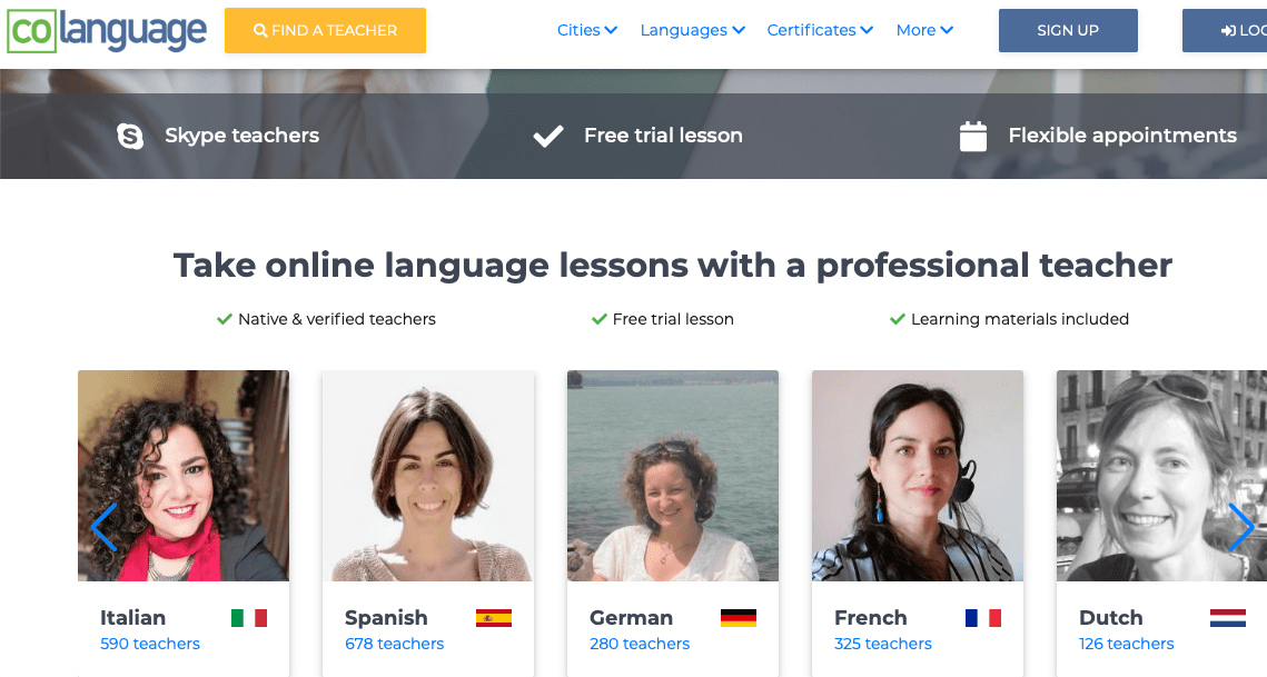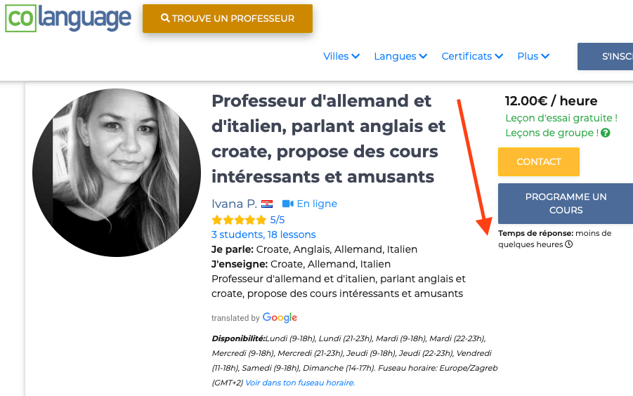 Co language est un site de qualitĂ© et Ă©prouvĂ©, comme le prouvent de nombreux tĂ©moignages et surtout notre essai (12 leçons), et se positionne dans le crĂ©neau du professorat de qualitĂ© contrairement aux multiples sites de tuteurs/profs oĂč l’uberisation des prix et le mĂ©lange des genres laissent le champ libre Ă toutes les dĂ©rives. Ici, c’est le choix de l’investissement Ă prix raisonnable, grĂące Ă internet, mais qui le plus souvent revient moins cher qu’une sĂ©rie de cours moyens, alĂ©atoires et sans garantie, Ă rĂ©server plus aux aventuriers des langues ou aux « juste curieux ».