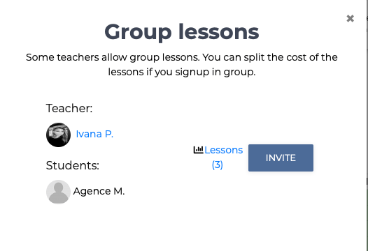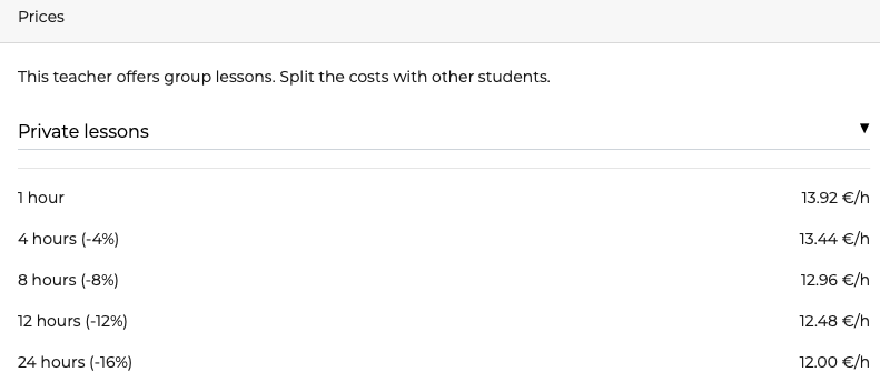 Un cours d’essai est possible (selon l’enseignant et prĂ©cisĂ© sur sa fiche ainsi que la possibilitĂ© d’un travail en groupe). On peut dans ce cas partager les frais, mais il s’agit d’un groupe ou d’amis que vous apportez, pas d’un regroupement d’Ă©lĂšves comme pour les groupes de conversations en ligne qui existent ailleurs.