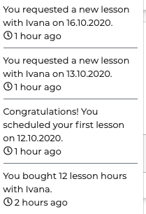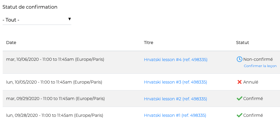 C’est vous qui rĂ©servez sur le planning de l’enseignant qui indique en vert les dates et heures disponibles. Cliquer sur la case et choisissez le temps du cours (dans mon cas 45 minutes, un bon plan pour rester concentrĂ©, mais suffisant pour avancer vraiment). Une fois enregistrĂ©, un message de confirmation et l’affichage dans votre compte sont immĂ©diats. Une possibilitĂ© de rĂ©tractation de 24 heures ou Ă voir avec le profâŻ! Quelques bugs parfois et une manip de cours un par un qui peut ĂȘtre parfois fastidieuse.