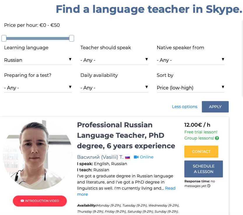 Elle est facilitĂ©e par une interface bien pensĂ©e avec de nombreuses options bien choisies. Le nombre est consĂ©quent et suffisant. Pour faire partie de la sĂ©lection, il est nĂ©cessaire d’apporter la preuve de ses capacitĂ©s de professorat et passer une interview. Un choix qui prĂ©sente un gros avantage, car Co Language sĂ©lectionnant ses intervenants, on ne tombe pas dans le fourre-tout habituel d’un certain nombre de sites mĂ©langeant professeurs, tuteurs ou aventuriers. De plus la trop grande abondance de profils devient trĂšs vite ingĂ©rable pour une recherche. Le choix reste toutefois ici assez large pour trouver son bonheur.