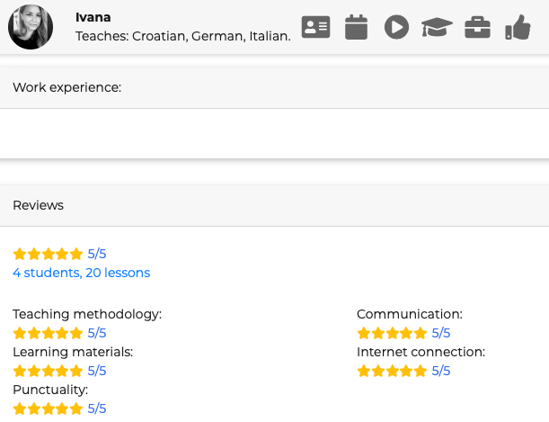 Les icĂŽnes permettent de naviguer sur le profil sĂ©lectionnĂ© avec, entre autres, une lecture de vrais commentaires. En cas de commentaires nĂ©gatifs, l’entreprise proposerait un changement de prof, une rĂ©vision du profil, une compensation, un remboursement… Les qualifications sont aussi prĂ©sentes :