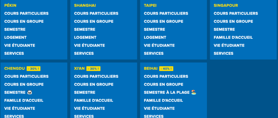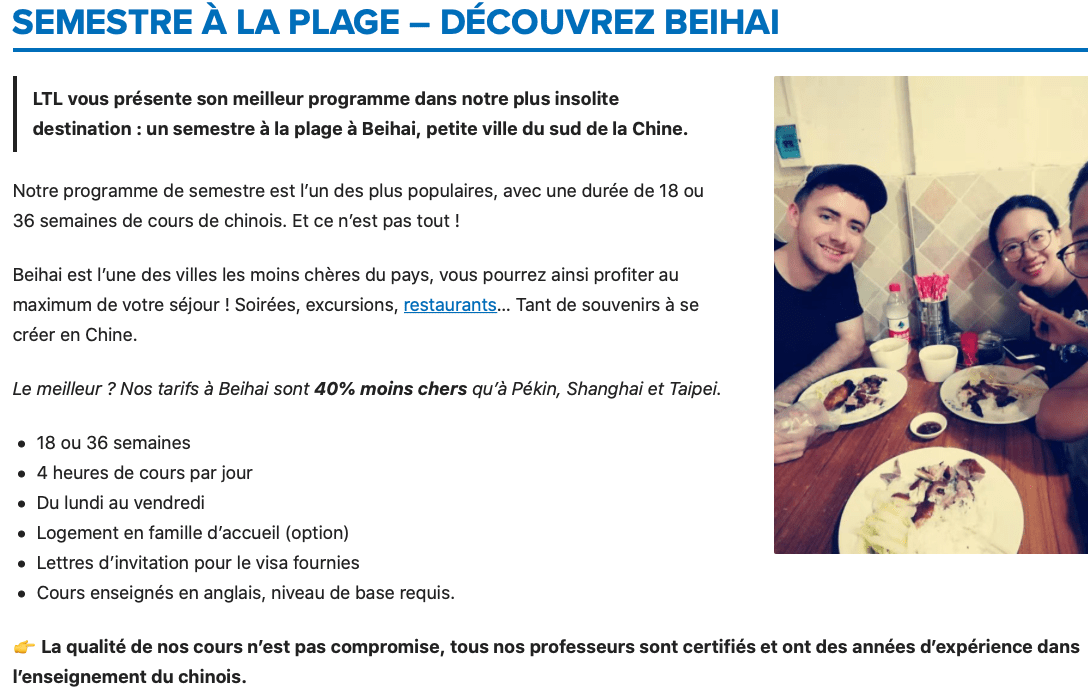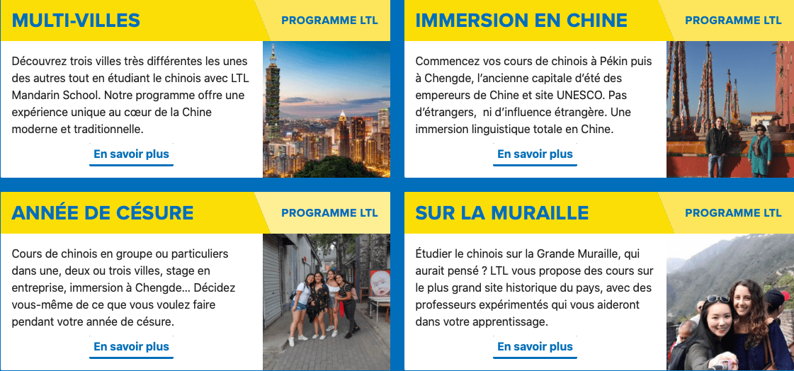 LTL mandarin school offre de nombreux services pour apprendre le chinois sur place. Pour tous les Ăąges et les besoins, son catalogue est variĂ© et impressionnant. Retenons en particulier la formule multivilles ou le stage en entrepriseâŻ!