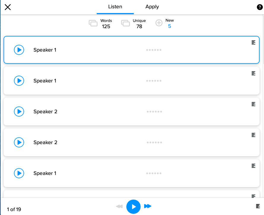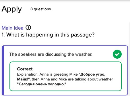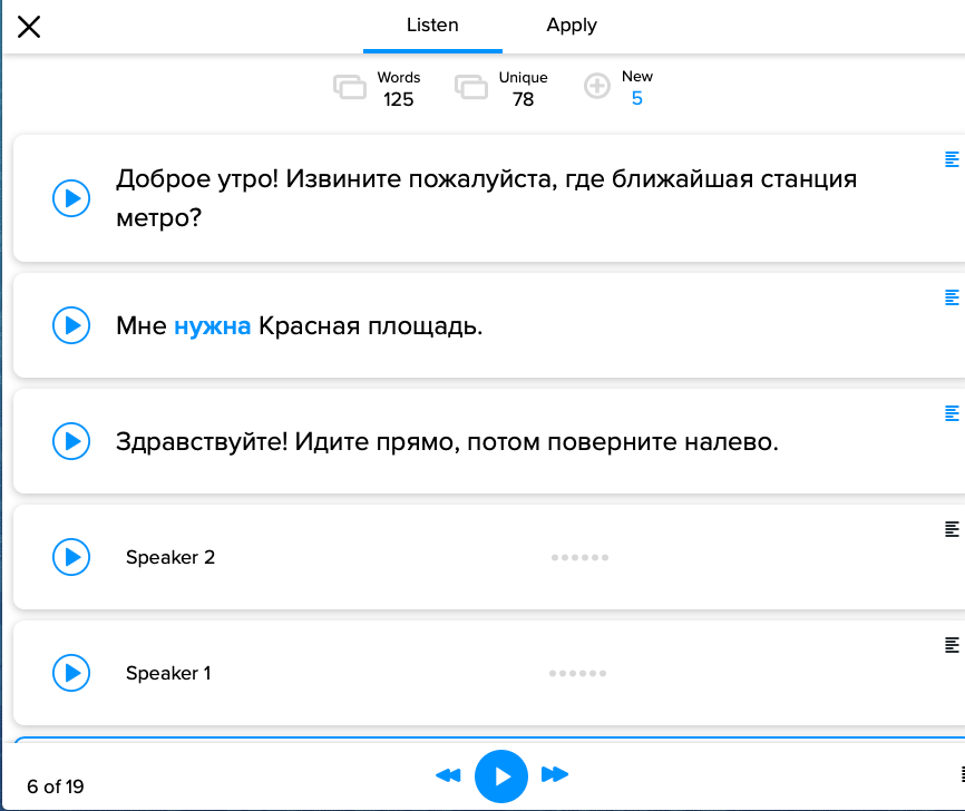 « Listen » est le travail d’Ă©coute de phrases courantes avec la transcription ligne par ligne. ĂlĂ©gant et pratique, on s’exprime dĂ©jĂ dans la langueâŻ! Une fois terminĂ© l’Ă©tude (comprenant les mots des leçons), on poursuit avec « Apply » qui fait appel Ă votre bonne comprĂ©hension du texte Ă l’aide de questions (Ă droite). On n’est donc plus dans la simple rĂ©pĂ©tition Ă usage mĂ©morielle, mais dans l’agilitĂ©âŻ! Noter les petites informations utiles, les traits pour la transcription et le menu « apply » pour poursuivre en toute libertĂ©âŻ!