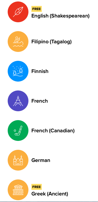 De trĂšs nombreuse langues inscrites au catalogue (la langue explicative est toutefois en anglais) et sont parfois trĂšs originales (certaines gratuites avec l’abonnement simple) comme le chaldĂ©en ou le dzongha. On comprend mieux Ă la lecture complĂšte de la liste l’engouement d’Ă©tablissements scolaires et universitaires pour cette application…