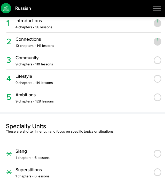 AprĂšs avoir choisi sa « main unit » (thĂšme), on sĂ©lectionne un chapitre (ci-dessous « places and directions ») et puis une leçon (des exercices en nombre trĂšs variable selon la langue). La couleur de la langue Ă©tudiĂ©e, ici le russe en vert, apparait dans les cercles des leçons complĂ©tĂ©es et la petite flĂšche bleue indique le dernier arrĂȘt. Facile de reprendre Ă tout momentâŻ!