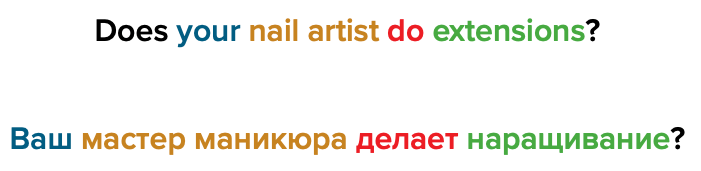 En plus de faire joli, les couleurs permettent de comparer la place des mots en anglais et dans la langue cible et donc de se familiariser avec la bonne construction de la phrase et de dĂ©couvrir l’originalitĂ© et les diffĂ©rences des langues sur ce sujet et la bonne pratique.