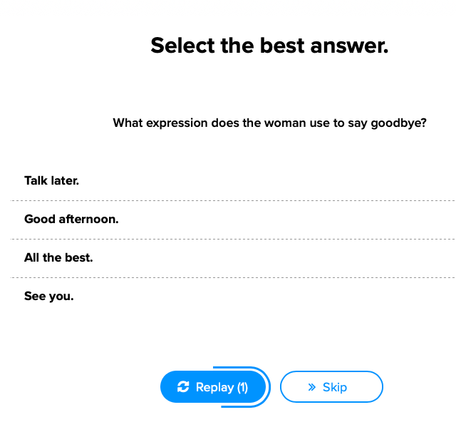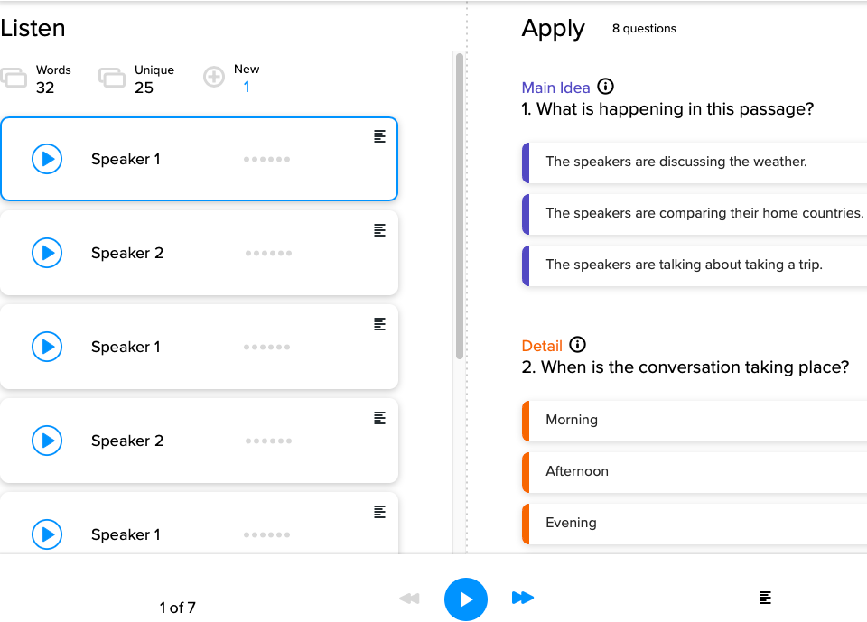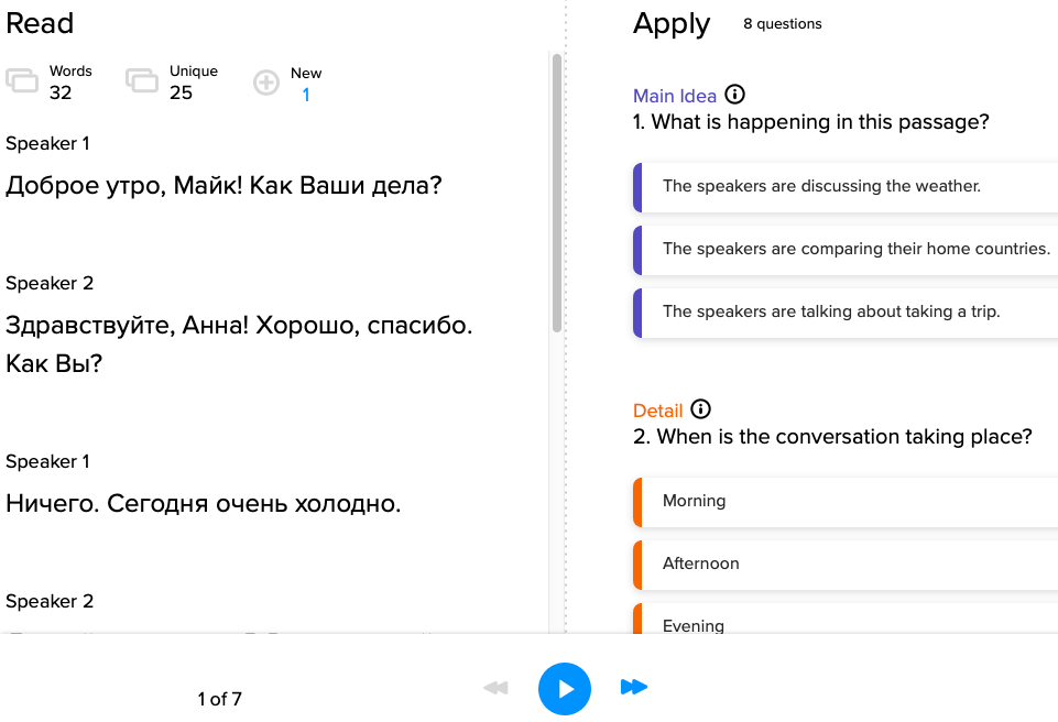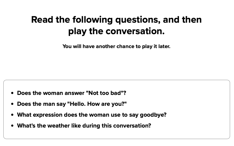 « Read » est l’approche par le texte et sa comprĂ©hension. Mais on peut aussi Ă©couter le dialogue avec le bouton bleu du bas ou entendre la prononciation en cliquant sur un mot. Des mots nouveaux sont ajoutĂ©s et en bleu (avec la traduction). Notons que les questions sont identiques dans listening et Reading. Une deuxiĂšme chance donc de bien rĂ©pondre…