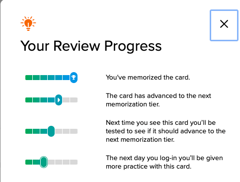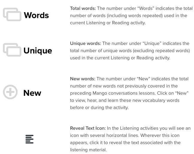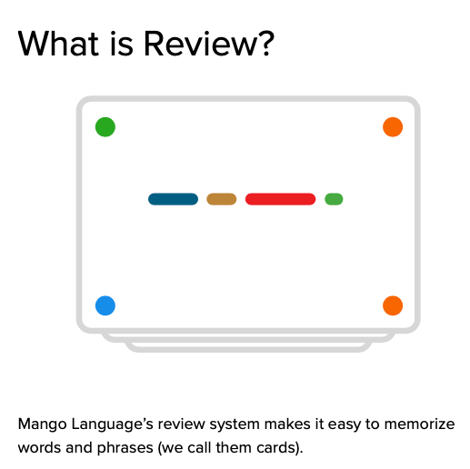 En cours de route, Mango propose une rĂ©vision de vocabulaire de leçons prĂ©cĂ©dentes pour accentuer la mĂ©morisation. Les « cartes » proposent des fonctions Ă l’aide d’icĂŽnes comme s’enregistrer, supprimer une phrase des listes de rĂ©vision ou réécouter. ImpeccableâŻ!