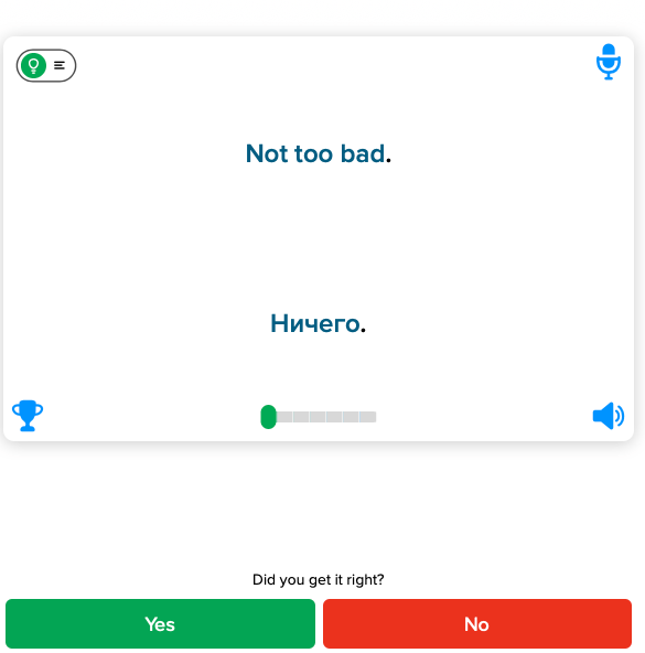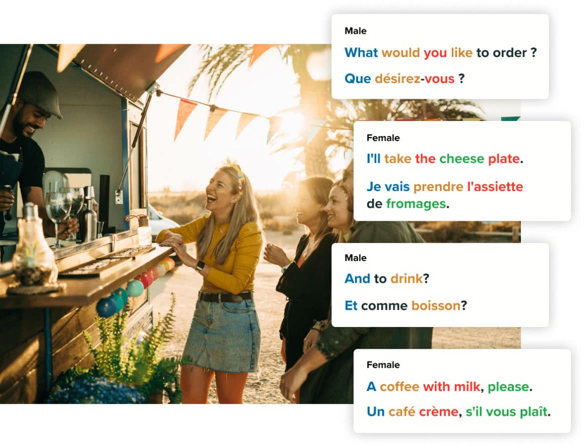 Une petite astuce avec un bouton parfois qui prĂ©sente la traduction littĂ©rale pour mieux comprendre le « phrasĂ© » local. Amusant de comprendre une expressionâŻ! Un truc malin et efficace est la rĂ©pĂ©tition d’un mot en mode vitesse lente en cliquant dessus…