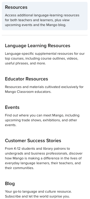 Mango s’adresse aux particuliers, mais aussi aux institutions de tout poil (enseignement, gouvernement, bibliothĂšques…) dont les adhĂ©rents bĂ©nĂ©ficient d’accĂšs gratuits. Les niveaux atteints correspondent Ă ceux de A1 et A2.