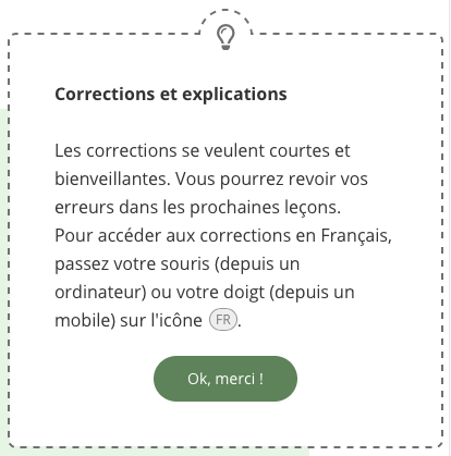 Au fur et Ă mesure de votre travail (et en particulier pour les premiĂšres leçons qui vous Ă©valuent pour proposer un cours adaptĂ©), un petit rapport pĂ©dagogique permet de vous situer dans le cadre europĂ©en des langues et baliser vos progrĂšs. Simple et suffisant, personne n’est lĂ pour vous commenter avec mĂ©chancetĂ© vos « mauvaises notes ». Miss ou sir bot ne s’intĂ©resse qu’Ă vos progrĂšsâŻ! Notons que la tournure des messages permet une certaine humanisation du procĂ©dĂ©. Une certification est aussi au menu.