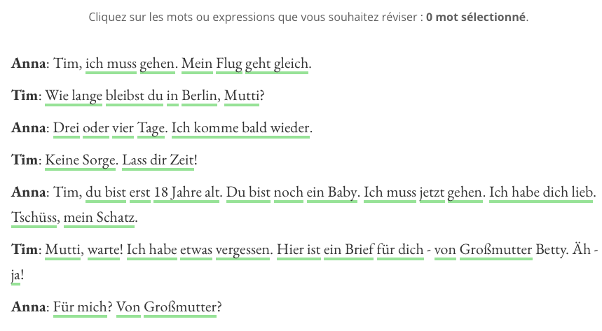 Le texte à cliquer pour sélectionner son vocabulaire à revoir (les mots soulignés)