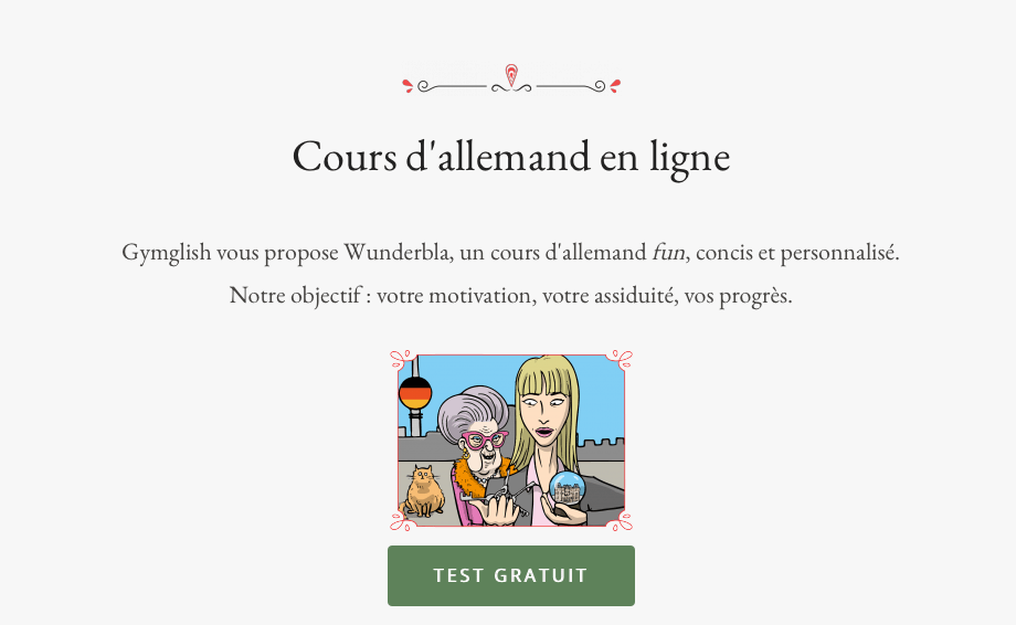TrĂšs belle et juste introduction pour ces cours innovants d’allemand. Une application sĂ©rieuse qui va en profondeur et dans la continuitĂ© de la rĂ©ussite de la version anglaise ou espagnole de Gymglish.