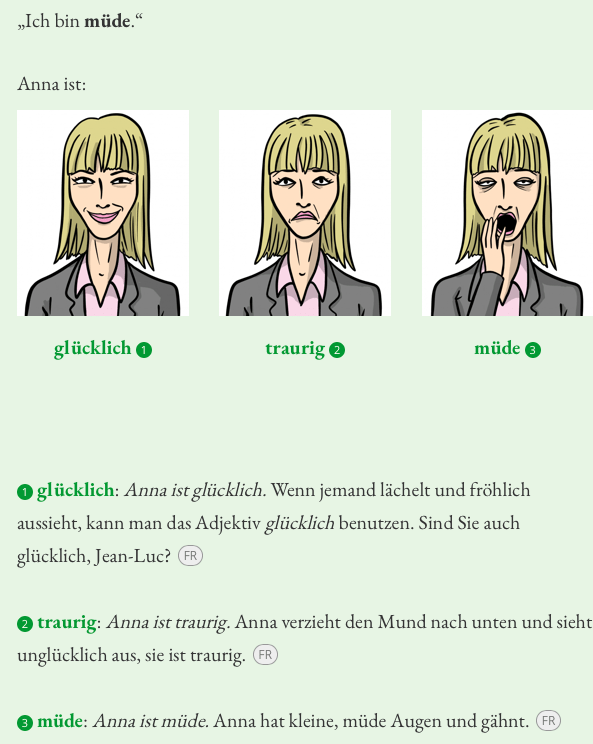 Elle est omniprĂ©sente en explications et exercices. Clairs et complets, on peut les lire en allemand, sinon utiliser l’icĂŽne de traduction. Ă vous de voirâŻ! Rester dans l’immersion est toutefois une bonne chose…