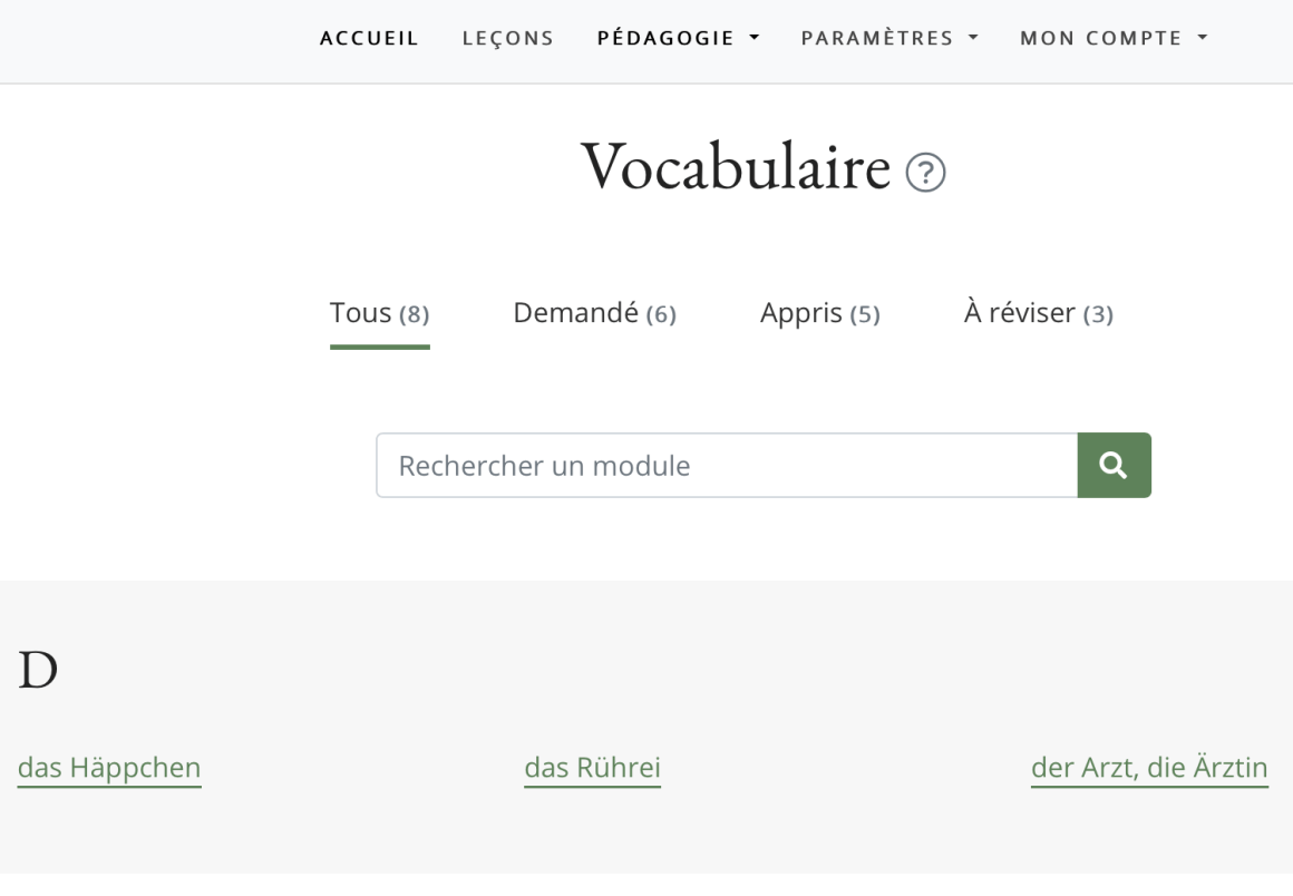 La leçon dĂ©marre par l’Ă©coute d’un texte (ou d’une vidĂ©o). On prĂ©cise l’accent… un truc malin. La transcription en allemand est proposĂ©e avec une fonction de choix des mots que vous souhaitez revoir (en gĂ©nĂ©ral ceux que l’on ne connait pas ou mal). Ils vous seront resservis jusqu’Ă la connaissance parfaite. Vous aurez d’ailleurs l’occasion de les retirer de la liste selon vos progrĂšs et votre envie.