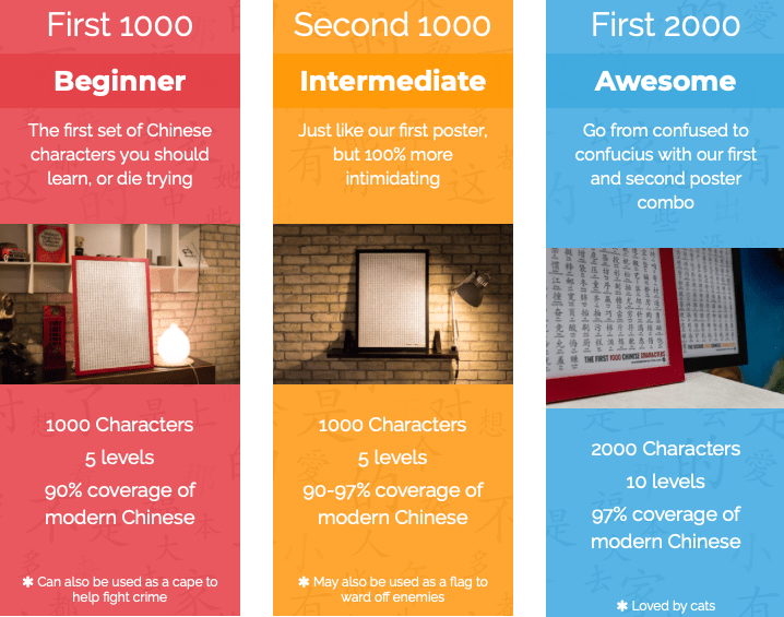 Une gamme d’affiche pour mettre au mur et visualiser Ă tout moment les caractĂšres chinois les plus usitĂ©s. Une astuce en fait trĂšs pratique et incitative Ă la fois pour rĂ©viser vos caractĂšres. Le mandarin, langue « visuelle », est tout simplement fait pour ce type de supportâŻ!