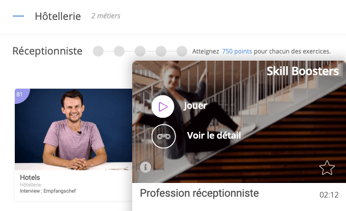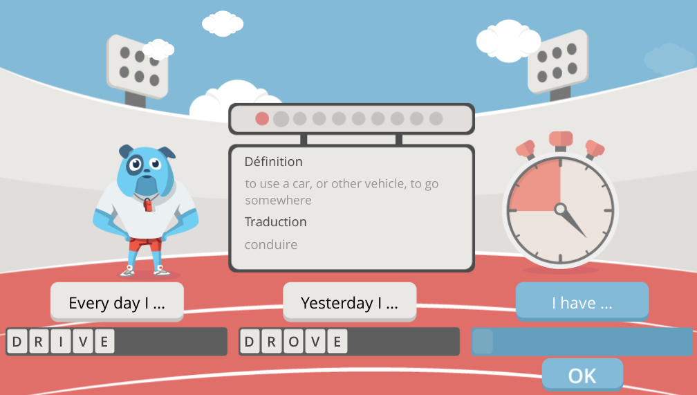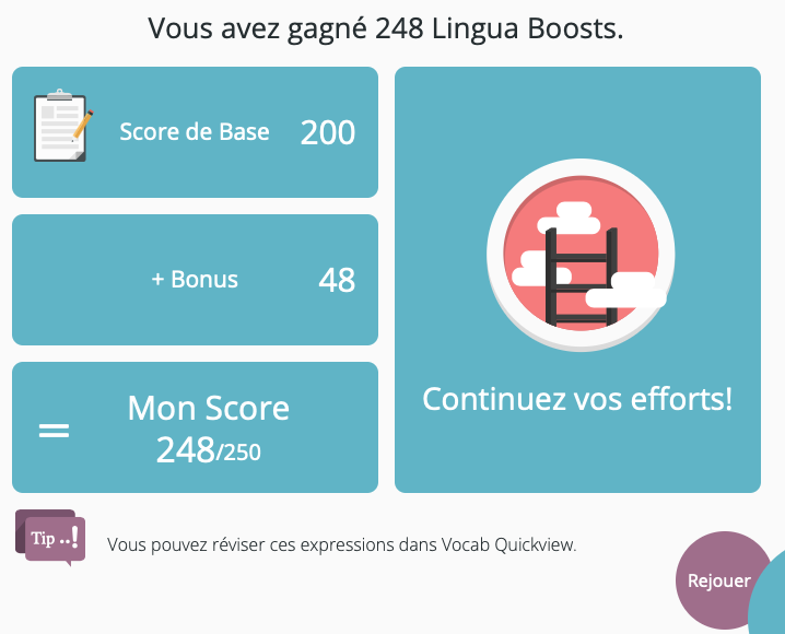 Chaque exercice a sa particularitĂ© et reprend le vocabulaire de la vidĂ©o. Ni trop longs, ni trop courts, ils ne sont pas des pensums, mais des extraits bien choisis. La mĂ©morisation est, au fil des exercices, naturelle et ludique. Notons que les niveaux avancĂ©s le sont vraimentâŻ! Il est habituel qu’ils soient plutĂŽt « faciles » sur le marchĂ© des applications en ligne pour faire plaisir aux clients…