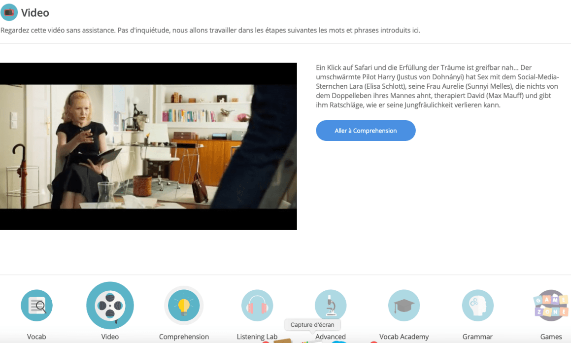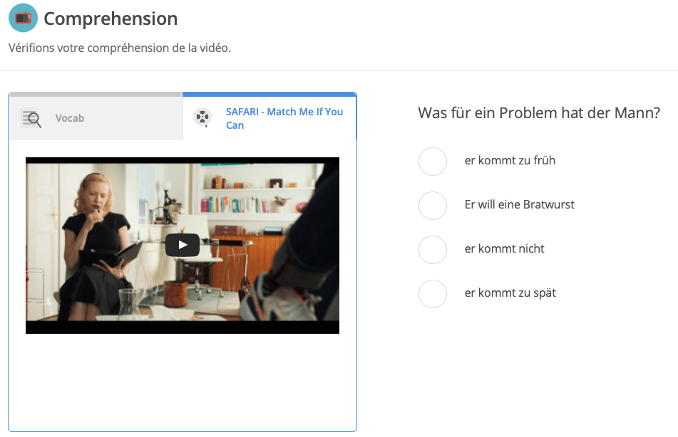 Une premiĂšre Ă©tape est la revue du vocabulaire pour mieux comprendre d’emblĂ©e la vidĂ©o. AprĂšs l’Ă©coute, on attaque des exercices et des jeux variĂ©s permettant d’Ă©tudier en profondeur et Ă 360° la vidĂ©o de rĂ©fĂ©rence pour un travail de mĂ©morisation et comprĂ©hension. On notera les diffĂ©rents aspects Ă Ă©tudier y compris de la grammaire.