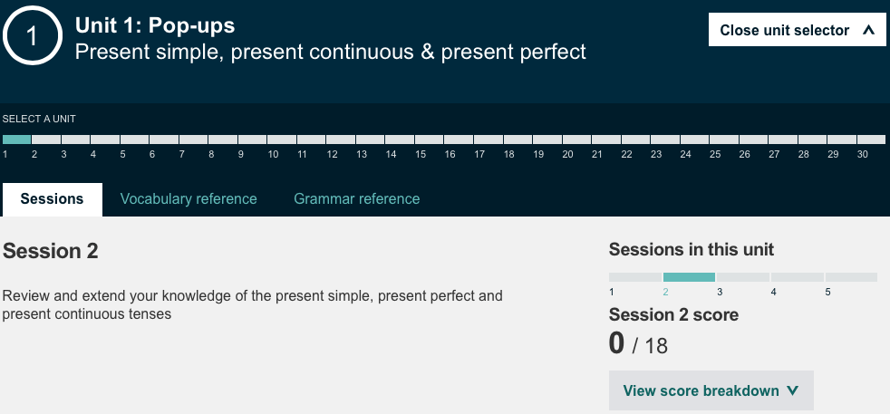 La base d’un cours est en gĂ©nĂ©ral, une vidĂ©o, une explication et des activitĂ©s en nombre trĂšs variables (de 2 Ă plus de 10). Une barre de progression en haut vous guide. Ils s’intĂšgrent dans un cursus appelĂ© session avec des « units » qui s’affichent dans la barre des menus comme ci-dessous :