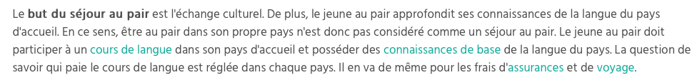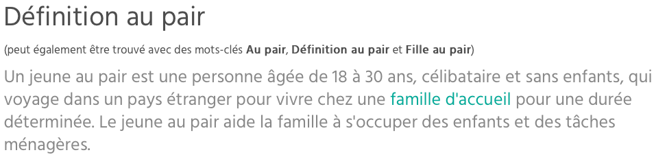Il est important au prĂ©alable de clarifier la dĂ©finition de l’expression « au pair » pour Ă©viter les malentendus… Le site propose d’ailleurs un remarquable glossaire des mots dĂ©diĂ©s Ă la formuleâŻ!