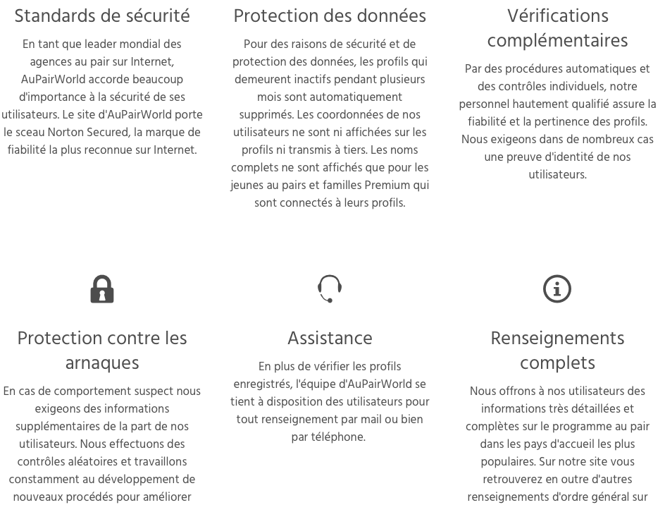 Aupairworld accorde une trĂšs grande importance aux informations complĂštes et Ă la sĂ©curitĂ©. ĂlĂ©ments de culture allemande trĂšs ancrĂ©s que l’on retrouve dans les pratiques industrielles et commerciales avec son horreur de l’imprĂ©vu et du flou/verbiage dans l’information. Vous trouverez donc tout au long de votre lecture de la prĂ©cision et de l’information qui sont particuliĂšrement rassurantes s’agissant d’un site de mise en contact et de sĂ©jours Ă l’Ă©tranger. Si pas sĂ©rieux s’abstenirâŻ!