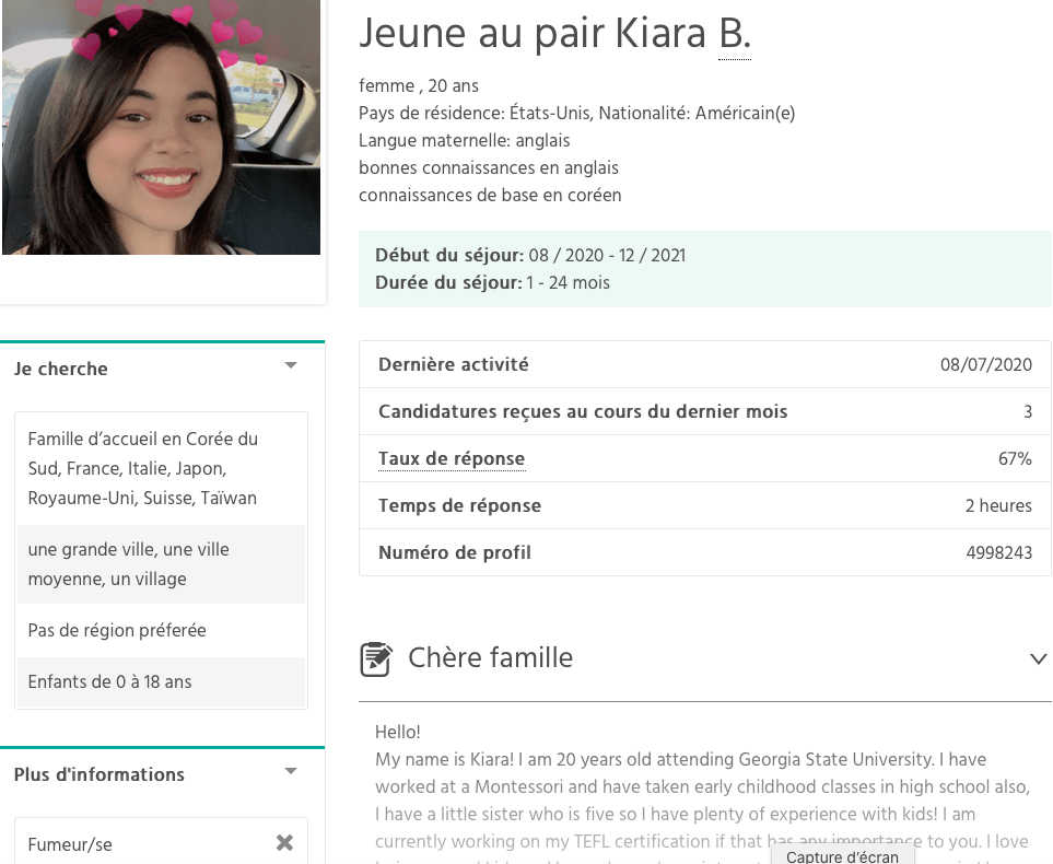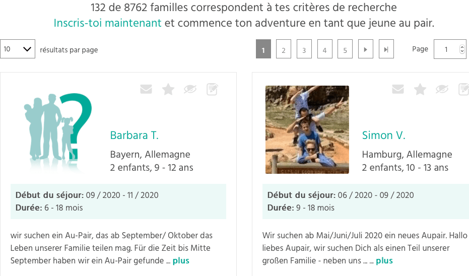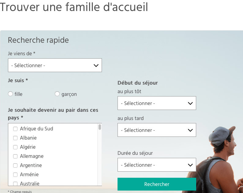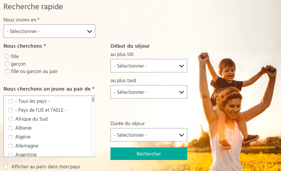 On retrouve la mĂȘme simplicitĂ© et sobriĂ©tĂ© pour la recherche d’un jeune au pair :