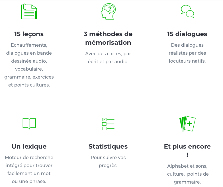 Une application Ă l’ambiance chaude et colorĂ©e, sympa Ă utiliser avec sa navigation aisĂ©e et facilitĂ©e par de plaisants pictogrammes ou le dĂ©filement au doigt droite-gauche. Le format est identique pour toutes langues avec quelques options manquantes pour certaines. Le menu est classiquement en bas, conçu pour les mobiles ou pad iOS mais peut-ĂȘtre Ă rĂ©organiser. SimplicitĂ© et clartĂ© des textes et des images favorisent l’apprentissage. Un bon point.