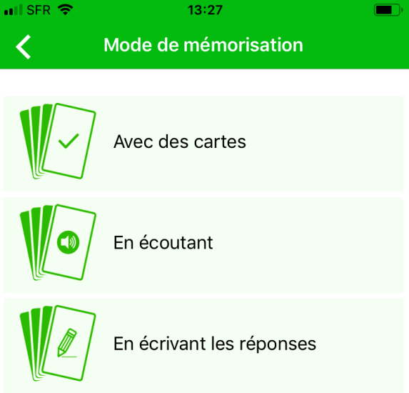 On trouve cette fonction dans cette rubrique, mais aussi Ă « mes cartes » et dans les diffĂ©rentes prĂ©sentations du vocabulaire. Dans une premiĂšre partie, diffĂ©rents modes de travail sont proposĂ©s et complĂ©mentaires. C’est un systĂšme de « flashcards » trĂšs bien conçu et visuellement attrayant.