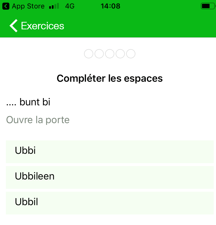 Les exercices, différents des quizz de mots (mais pas toujours existants selon la langue choisie)