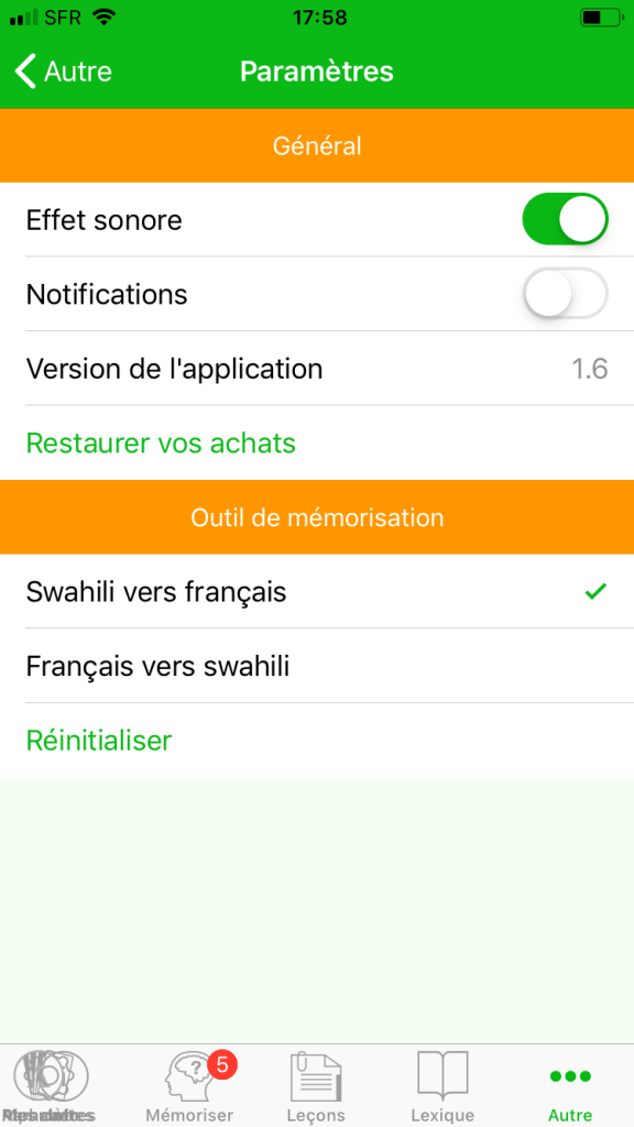 Les leçons sont la premiĂšre Ă©tape Ă rĂ©aliser. On acquiert donc dans un premier temps des mots qui s’accumulent dans une base de donnĂ©es, gĂ©rable et utilisable avec la fonction mĂ©moriser. Un lexique complet pour une rĂ©vision, un alphabet et des listes triĂ©es par type de mots complĂštent l’apprentissage. Les paramĂštres sont accessibles Ă l’aide de deux icĂŽnes (les regrouper aurait Ă©tĂ© mieux…). On ajoute, pour certaines langues seulement, deux fonctions, grammaire et exercices. Les outils de mĂ©morisation sont bien Ă©tudiĂ©s et pratiques sans ĂȘtre une usine Ă gaz. Ils sont simples, classiques et trĂšs efficaces, mais suffisamment variĂ©s pour bien mĂ©moriser et ne pas lasser. Bien pensĂ©âŻ!